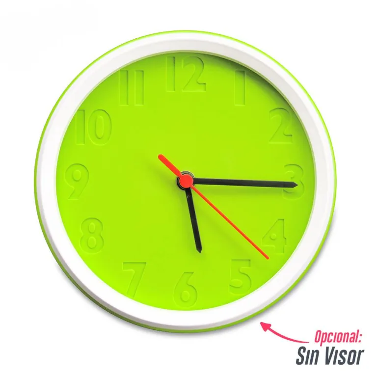Reloj de Pared Colors, Reloj de pared con base en Poliestireno de Alto Impacto, números en bajo relieve, aro en ABS, visor en poliestireno cristal. Puede combinar la base y el aro en diferentes colores de línea. Opcional con o sin visor. Precio incluye mecanismo y manecillas negras REL-152. Empaque caja individual en cartulina blanca. Color especial mínimo de pedido 5.000 unidades. Fabricación sobre pedido. Cantidad mínima de inyección o fabricación son 300 unidades por color.